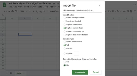 En este momento ya podemos crear una hoja de cálculo de google sheets e importar el archivo descargado que suele tener el siguiente nombre «Site Catalyst Classifications.tab»