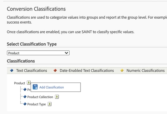 El primer paso que debemos realizar para crear una clasificación es configurarla para una determinada report suite: hacer click en el menú Admin> Report Suites> Select a Report Suite> Edit Settings> Conversion (or Traffic) > Conversion (or Traffic) Classifications.