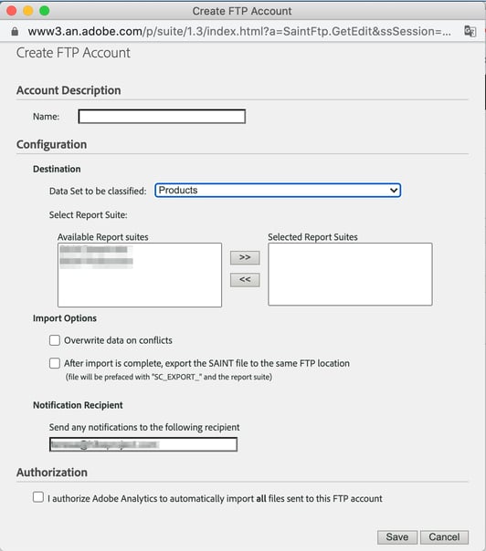 Al hacer click en Add New aparecerá una pestaña en la que hay que seleccionar el conjunto de datos (variable clasificada) y las report suites. Una vez que la cuenta se haya guardado aparecerá un pop up con las credenciales FTP (host, nombre de usuario, contraseña).