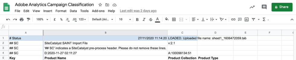 Una vez que la clasificación se haya cargado en Adobe Analytics se añadirá a la hoja una nueva línea resaltada en azul (fila número uno) que indicará el estado de la carga de la Clasificación: