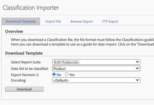 Una vez hemos llegado a este cuadro, añadimos la report suite en la que queremos subir la clasificación, seleccionamos la variable y hacemos click en descargar: