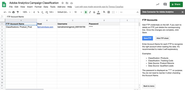 Una vez creada la cuenta ftp es necesario descargar el conector de Adobe Analytics para Google Sheets y posteriormente ejecutarlo: