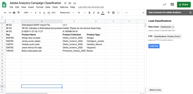 En la hoja de clasificación ya pueden añadirse las clasificaciones correspondientes a la variable key. En el ejemplo, la variable key indica la referencia de producto y los atributos a subir serían product name, product type y product collection. En este punto habría que hacer clic en Cargar en Clasificaciones en el menú de la barra lateral de complementos:
