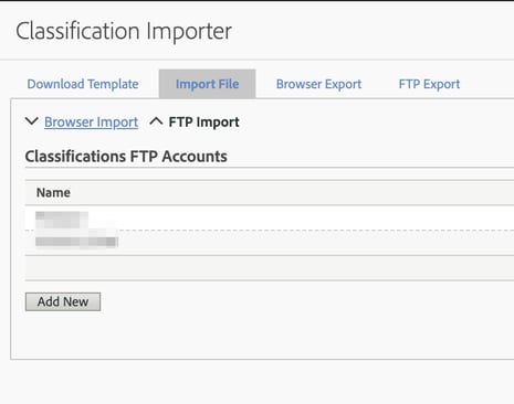 Llegados a este punto es necesario crear una cuenta FTP vinculada a la clasificación en Adobe Analytics. Hacer click en el menú Admin>Classification Importer>pestaña Import file>Add new